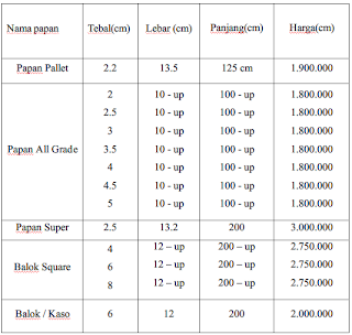 Dengan demikian, semakin besar diameter kayu jati semakin tinggi harganya. 2. Kayu Eboni ( kayu hitam ) Kayu Eboni/kayu hitam ( Diospyros celebica Bakh ) adalah salah satu jenis tumbuhan berkayu yang termasuk dalam marga Diospyros yang merupakan salah satu marga dari suku Ebeneceae dan tumbuh di daerah pegunungan-pegunungan berbukit dataran rendah, hingga mencapai ketinggian 700 m dari permukaan laut. Pertumbuhan dan perkembangan tanaman Eboni rata-rata temperatur udara 22-280 C. Kayu Eboni termasuk kayu yang memiliki nilai deguratif dan ekonomis yang sangat tinggi, sehingga banyak digunakan untuk pembuatan mebeler, dekorasi ( hiasan ) dan lain-lain. Kayu eboni mempunyai harga jual yang sangat tinggi dipasaran. Kayu hitam juga adalah salah satu kayu spesifik ( asli ) Sulawesi yang termasuk jenis mewah ( fancy wood ) yang tumbuh tersebar di sulawesi, terutama sulawesi tengah ( Kabupaten Parigi, Poso, Dongala, Toil-toli, Kolonodale dan Luwuk ), Sulawesi Selatan ( Kabupaten Maros, Barru, Luwu dan Mamuju ) dan Sulawesi Utara ( Kabupaten Minahasa dan Bolaan Mongondow ). 3. Kayu Mahoni Kayu mahoni termasuk pohon besar dengan tinggi yang mencapai 35-40 m. Untuk pemasaran kayu mahoni biasanya diproduksi dalam bentuk papan atau balok, baik papan pallet,papan all grade maupun papan super. Untuk balok biasanya dibuat balok square atau kaso dengan harga jual yang berbeda-beda, dengan rincian per tanggal 2 januari 2011 adalah sebagai berikut :